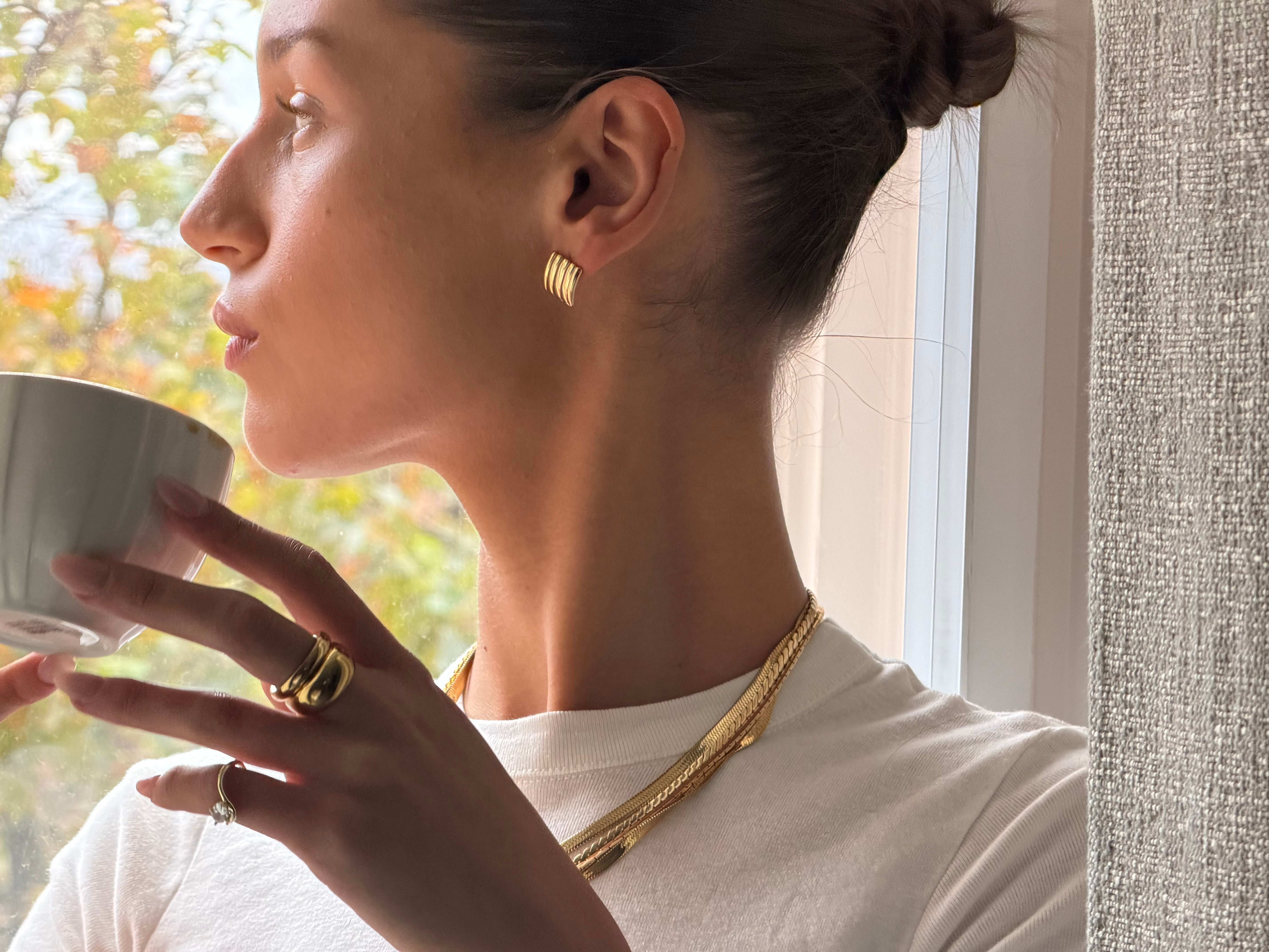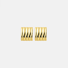 Our famous mini statement Yasmin earrings feature a bold, ridged, retro-inspired design perfect for a finishing touch to a laid back look.
