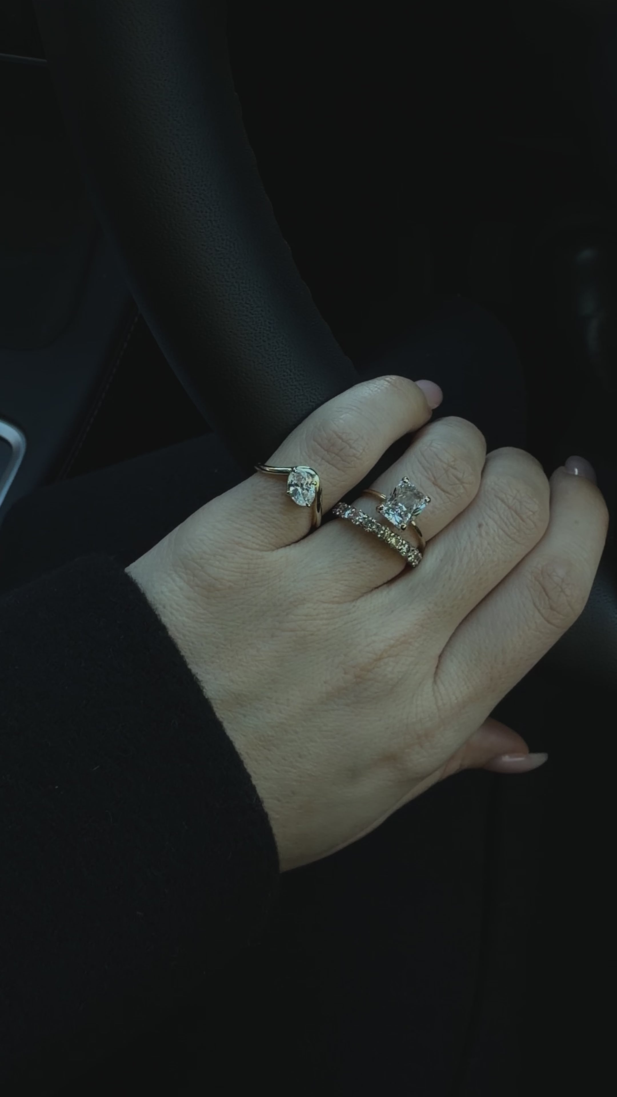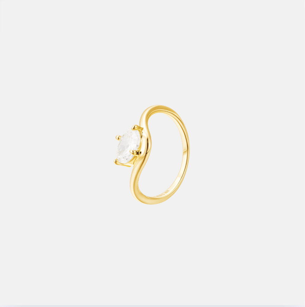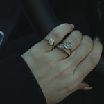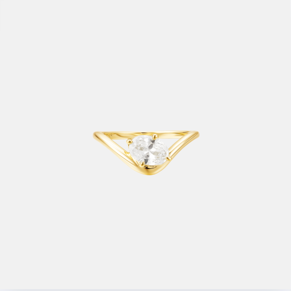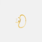 Aire is the pinky ring with presence. A controlled curve of gold, finished with a single diamond. Sleek, sculptural, and a little rebellious- the kind of piece that says more by doing less. Model is wearing size 4 on her pinky.